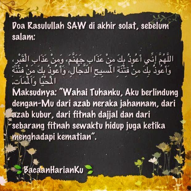 “Allaahumma innii a’uudzubika min ‘adzaabin-naar wa min ‘adzaabil-qabri, wa min fitnaish-shadr, wa suuil-mahyaa wal-mamaati(Ya Allah, sesungguhnya aku berlindung kepada-Mu dari adzab neraka, adzab kubur, fitnah hati, dan kejelekan kehidupan dan sesudah mati)”